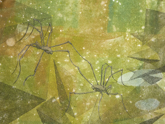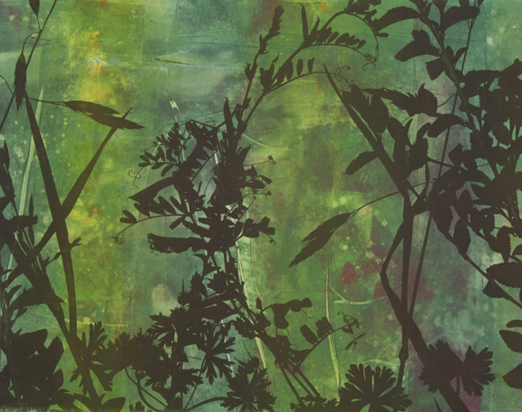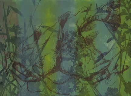 "Shared Hunger" Digital Lithography (2-plate) on Monotype and leaves 16"x12"